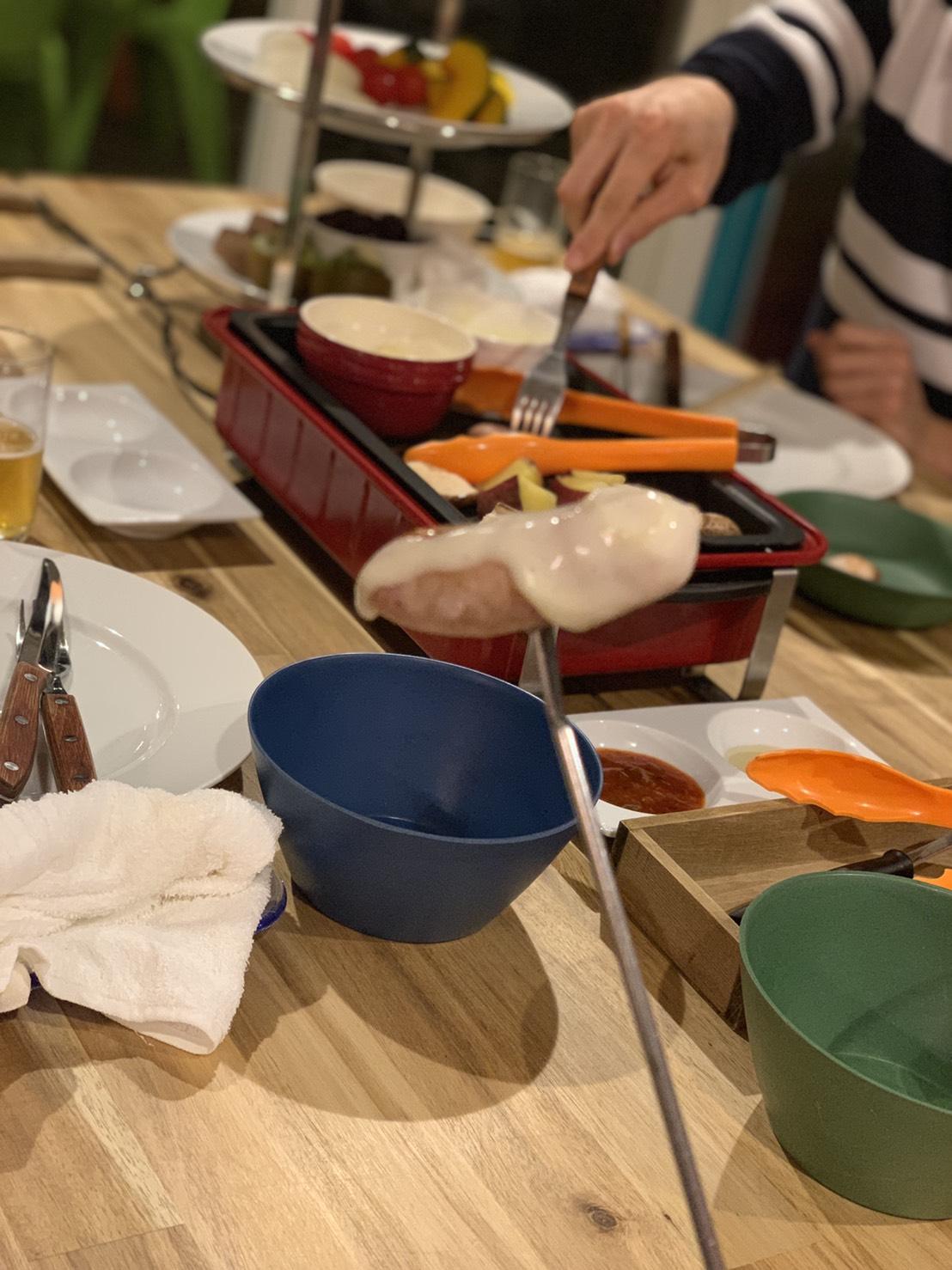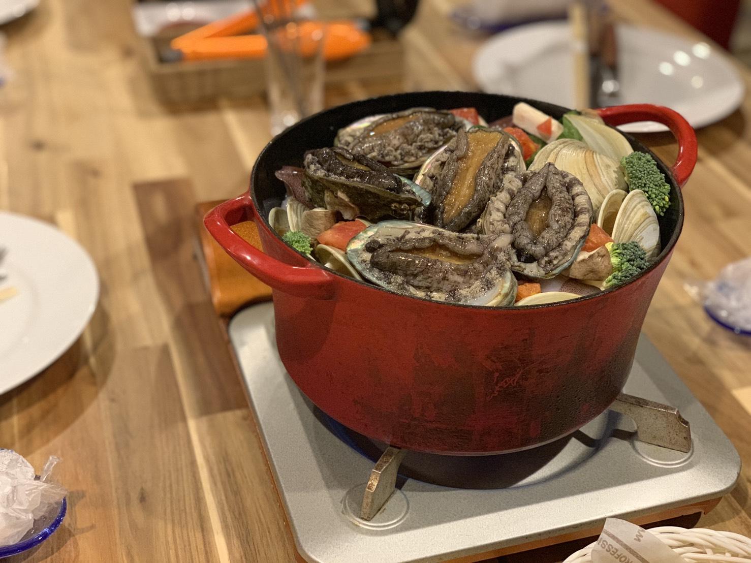 夜ご飯は「アクアパッツァ」一人1つ大きいアワビもあり、チーズフォンデュもあり、もちろんワインも楽しみ、非常にゆっくりと、しかし、十分に楽しむことができました。