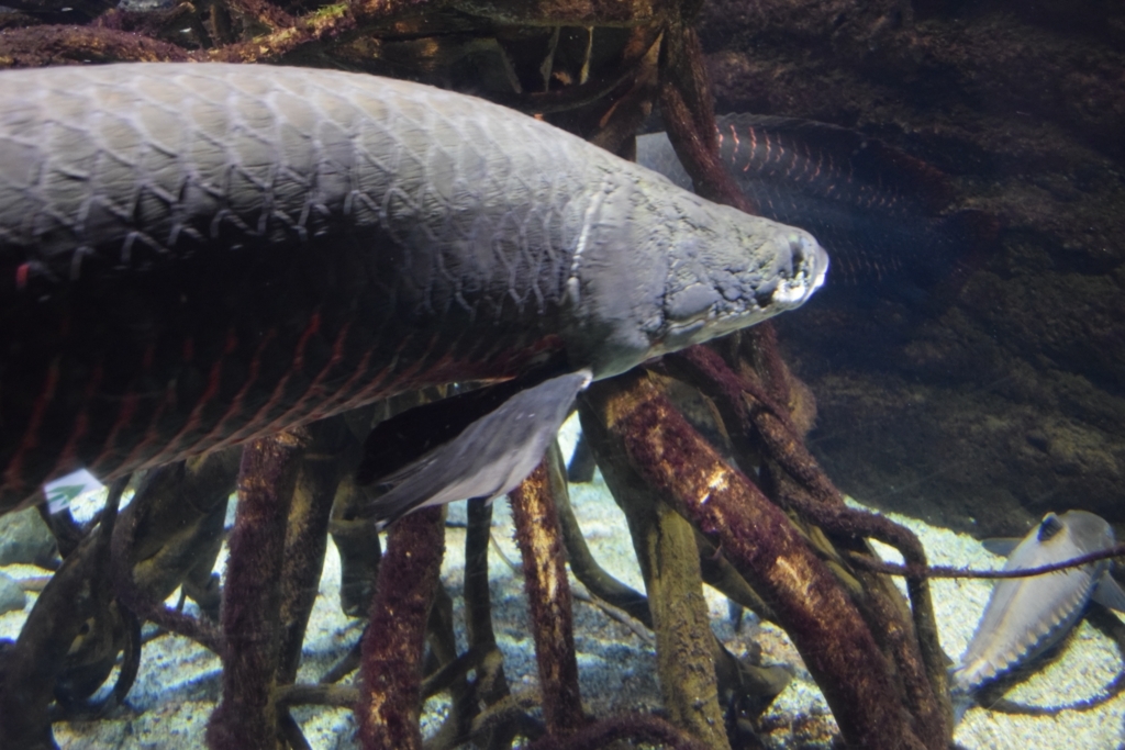 このカピバラ水槽に水の中には世界最大の淡水魚ピラルクいました。