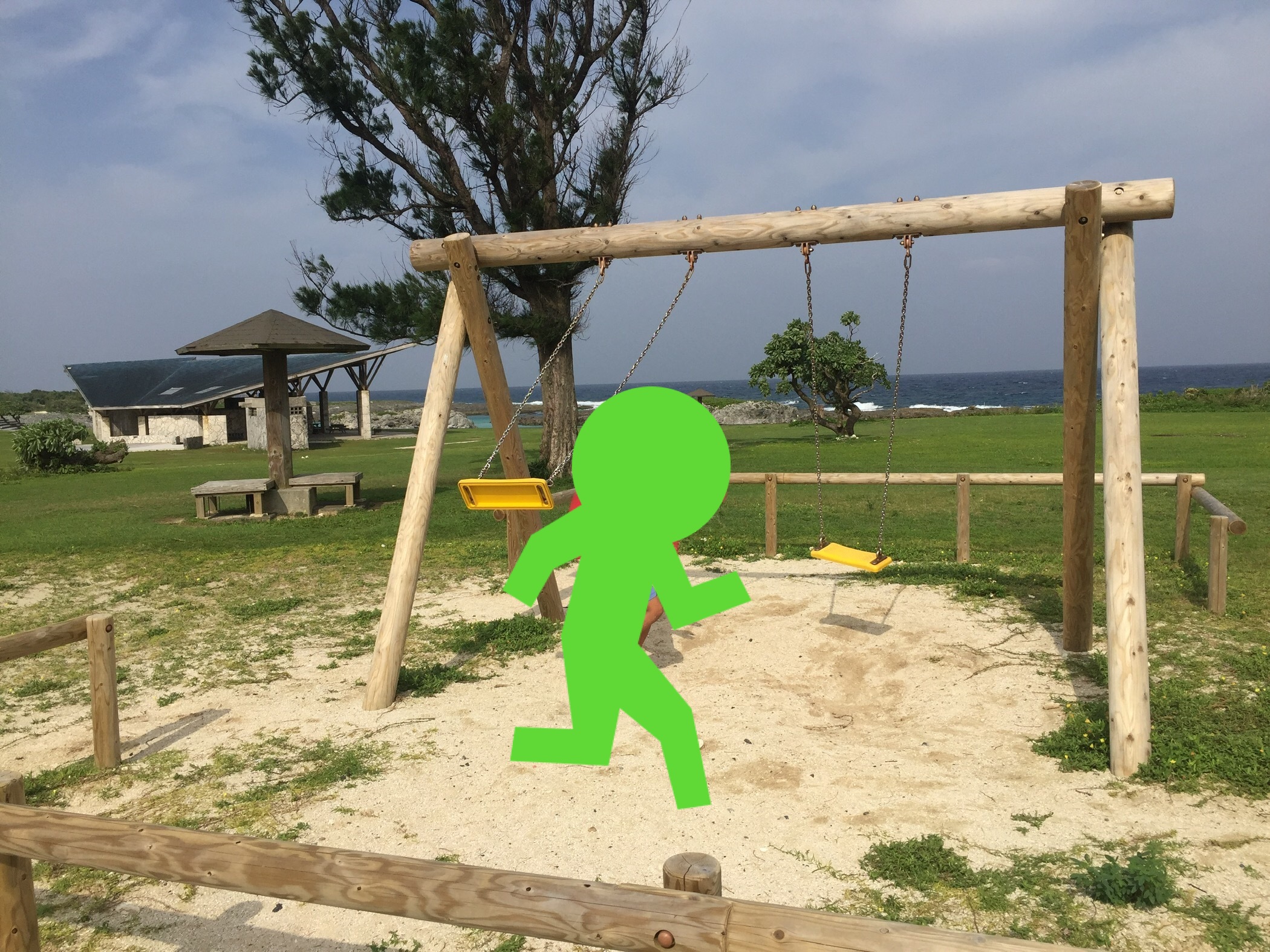 次の日の朝、公園の裏側にテントを張ったので、公園の方に行ってみると、広くてきれいに整備された公園の向こうには美しい海が。前日の大変だったことは、すべて吹き飛びました。まだ肌寒かったので、残念ながら海遊びはできませんでしたが、夏は海水浴も楽しめるそうです。